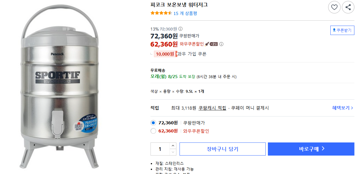 피코크 보온보냉 워터저그 - 아이스물통/워터저그 | 쿠팡